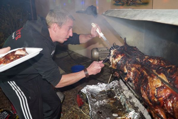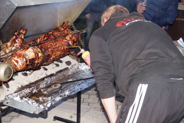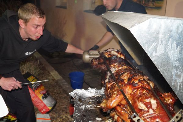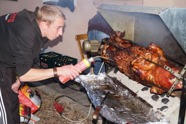 | Auch die FFW-Mädels Sonja und Verena konnten sich fürs Spanferkel-Essen begeistern |