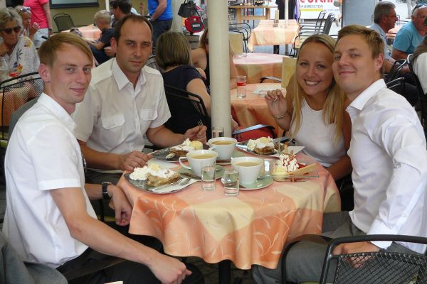 Entspanntes Kaffee-Trinken nach der Hochzeit in der wunderschönen Altstadt von Rattenberg
