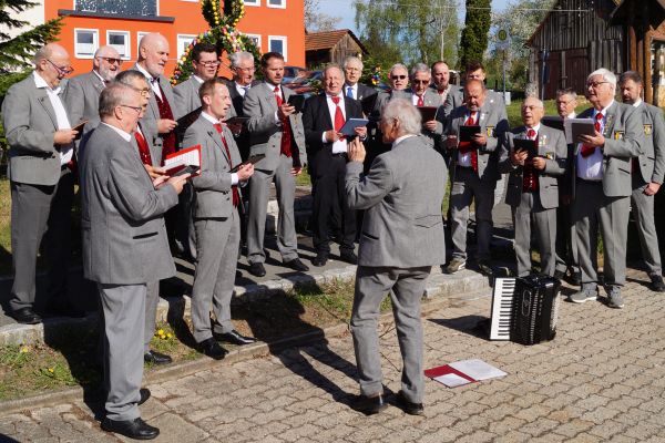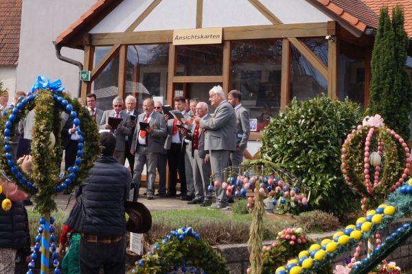 | Der Gesangverein Gemütlichkeit Geschwand nach dem Ostergottesdienst 2025 am Osterbrunnen in Bieberbach |