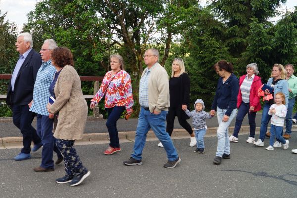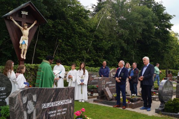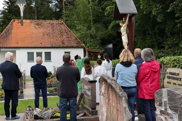Mit einer kleinen Feierstunde wurde am 10. Juni 2024 das neurestaurierte Kreuz auf dem Friedhof in Geschwand gesegnet. Kaplan Pater Daniel Bara zelebrierte in der Flilialkirche "Mariä Himmelfahrt" in Geschwand den Festgttesdienst. Nach dem Gottesdienst zogen die Gläubigen in einem kleinen Kirchenzug hoch zum Friedhof. Dort segnete Kaplan Pater Daniel Bara das neurestaurierte Kreuz. Im Anschluss trafen sich die gemütliches Besammensein neben der Mariengrotte. Die Restaurierung des Kreuzes wurde durch eine großzügige Spende von Andreas Eckert aus Buchau ermöglicht. Günther Hendl aus Schnaittach führte die Restaurierung des Kreuzes durch.