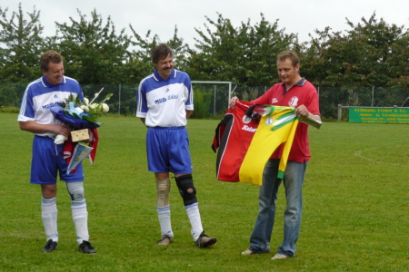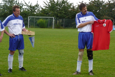 | Im Jahre 1987 sind die Fußballer des TSV Geschwand erstmals in die damalige B-Klasse aufgestiegen. Dieser Erfolg wurde nach jetzt 20 Jahren gebührend gefeiert: Mit einem Einlagespiel der damaligen Aufstiegself gegen die Ü 40 des SC Kühlenfels, die sich glücklich mit 6:5 durchsetzte. Dass es früher einmal schneller ging, merkte Reinhold Eckert, der einzige heute noch aktive Fußballer der Aufstiegself, schon nach fünf Minuten. "Na kummt halt", forderte er seine Mitspieler auf, als sie bei einer Kontermöglichkeit nicht schnell genug nachrückten. Auch heute noch ist Eckert mit 43 Jahren eine der Stützen der ersten Mannschaft des TSV Geschwand. "Mit seiner Erfahrung und seiner Übersicht als Libero ist er immer noch wertvoll für uns", sagte Bülent Yildirici am Spielfeldrand. Der Spieler der aktuellen ERSTEN war einer von über 100 Zuschauern, die trotz des schlechten Wetters den Auftritt der Altstars nicht versäumen wollten. Und sie alle kamen auf ihre Kosten. Feine Doppelpässe, gelungene Spielzüge und viele Tore wurden geboten, wobei sich vor allem zwei Akteure in der ersten Halbzeit besonders hervortaten: Natürlich Reini Eckert, der zunächst mit einem Fernschuss beide Pfosten gleichzeitig testete, ehe er mit einem satten 25-Meter-Schuss seinen Treffer markierte. Aber auch Reini Igl, in den 90ern sechs Jahre Trainer beim TSV Geschwand, spielte sich mit zwei Treffern in Halbzeit eins in den Vordergrund: Allerdings traf der gebürtige Kühlenfelser zunächst für die gegnerischen Farben. Ob ihn der TSV-Vorsitzende und Stadionsprecher Karl-Heinz Melch deswegen DOPPELHERZ nannte? "Jetzt wird’s Zeit, dass Du endlich unser Trikot anziehst" forderte er Igl nach dessen zweitem Treffer auf. Als Igl dies in der Halbzeit auch tat und auch für den TSV Geschwand einlochte, war auch Josef Eckert, sein Gegenspieler aus dem ersten Abschnitt, wieder versöhnt. Josef Eckert hatte sozusagen den weitesten Anfahrtsweg der 87er-Aufstiegself. Seit über 15 Jahren war ich nicht mehr in Geschwand, berichtete der Lehrer, der die letzten Jahre an einer deutschen Schule in Ägypten unterrichtet hat. Dort hatte ich kaum Gelegenheit zum Sport, sagte er, sichtlich außer Atem, nach den Spiel. Doch dafür, dass große Teile der Aufstiegsmannschaft nicht mehr aktiv gegen den Ball treten, schlugen sie sich recht wacker. Mit einer furiosen Aufholjagd verkürzten sie durch Treffer von Horst Zimmerer und Stephan Hauptmann, Geschwands Rekordspieler (883 Einsätze), noch auf 5:6. Überlegt schob Zimmerer, der für Geschwand in 82 Spielen 98 Tore erzielte, wie in alten Zeiten aus acht Metern den Ball ins Eck. Doch dass es zum Ausgleich nicht mehr reichte, war in Geschwand eher Nebensache, da nach dem Spiel das gemütliche Beisammensein im Vordergrund stand. Außerdem hätte man ja sogar mit 7:4 gewonnen, wenn man die zwei Tore von Igl der richtigen Seite zuschreibt. Aufgebot TSV Geschwand 1987/ 2007: Stephan Hauptmann, Martin Gmelch, Edmund Wiegärtner, Josef Eckert, Armin Dümler, Roland Bischoff, Alvin Dresel, Horst Zimmerer, Reinhold Eckert, Siegmund Zimmerer, Lorenz Wiegärtner, Siggi Neuner, Paul Hauptmann, Georg Mayer, Johannes Mayer, Reini Igl. |